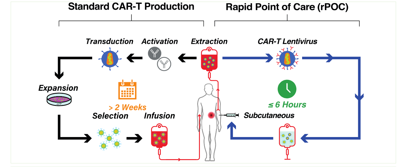 - The entire process of genetic modification of PBMC and SC dosing can be completed in less than six hours, resulting in targeted genetic modification of T cells w/o prior activation. This represents a significant step forward for advancing rapid Point-of-Care (rPOC) CAR-T therapies.